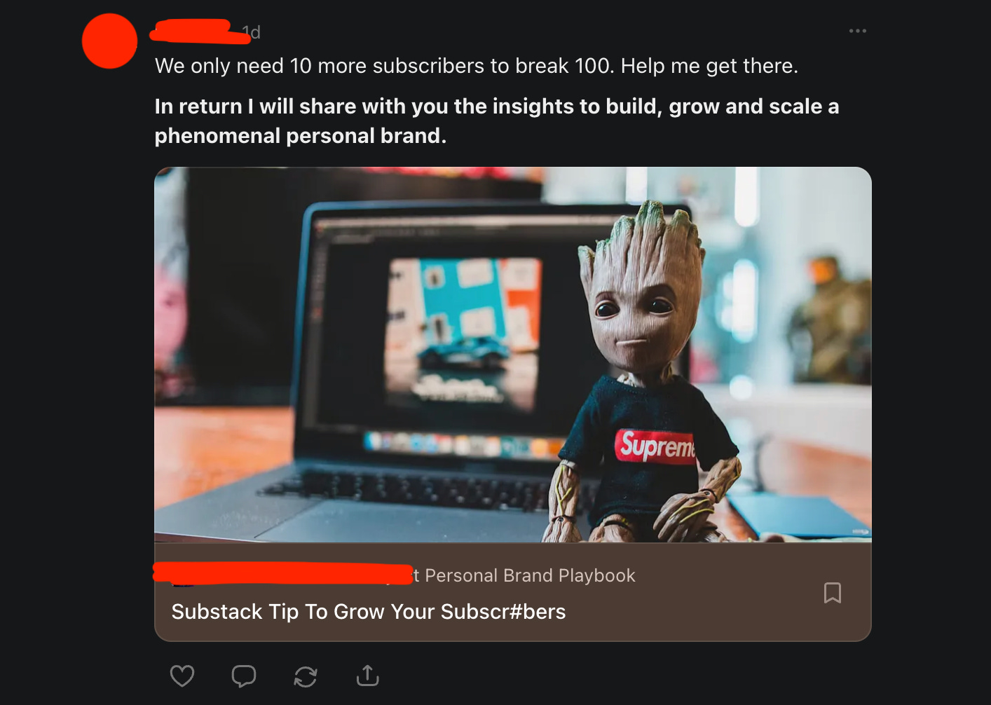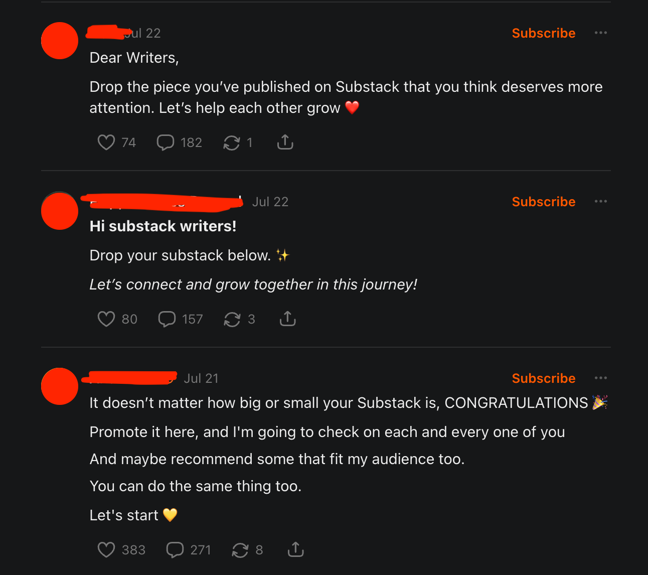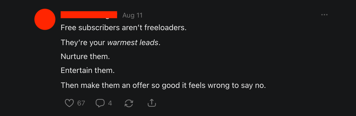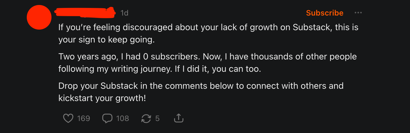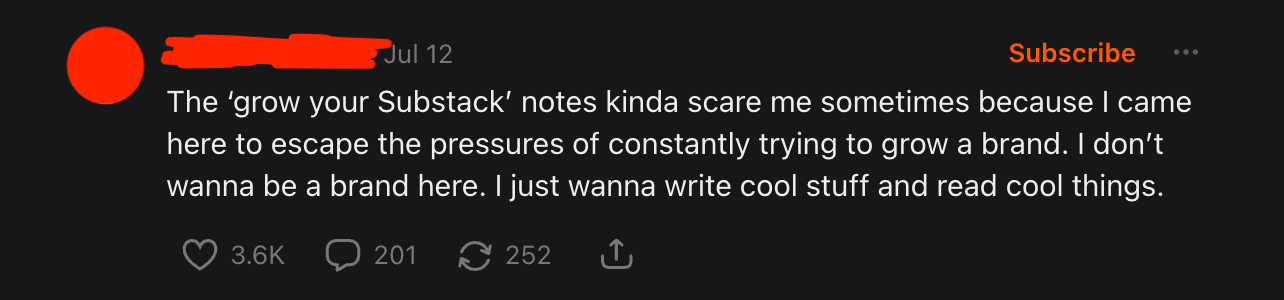 Support resonates particularly strongly on Substack because it’s marketed as one of the internet’s last bastions of community-powered work. It’s why we see so much community-coded language here (some sincere) versus other platforms — and why it also becomes the bait.