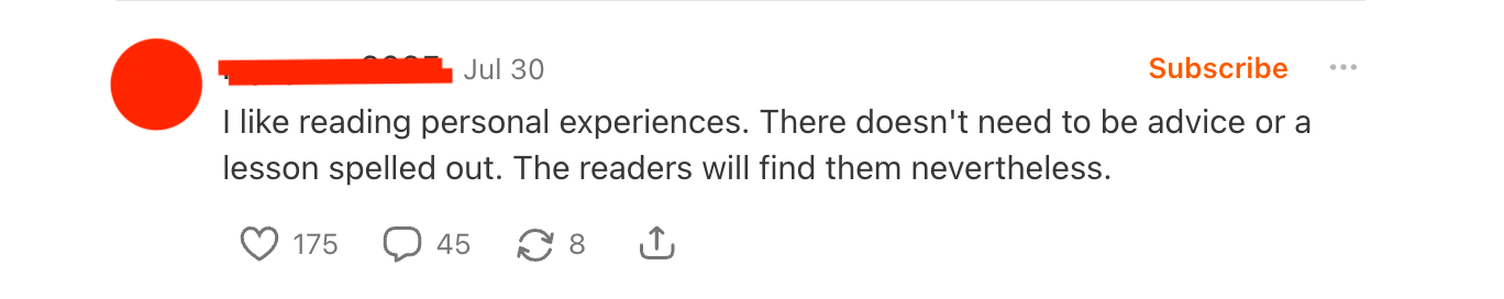 🗣️ “At first I thought this essay was broken — so many words yet no upfront thesis or takeaways, no ‘useful’ lesson. But I kept reading. Now I actually like it when I’m not told what to think or feel.” — @freelancew1zard420