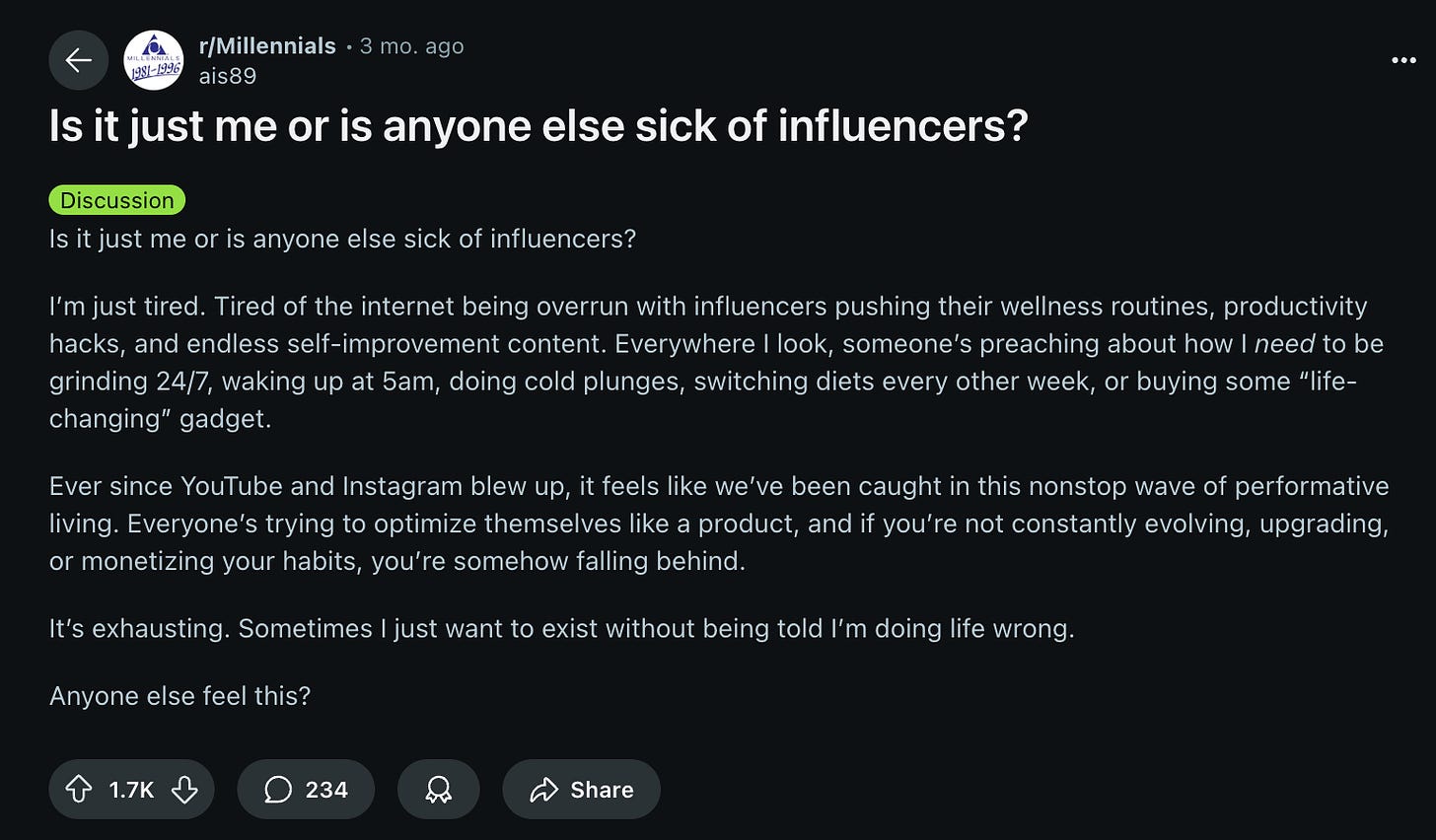 The scroll now blurs into a parade of people shapeshifting from “just like you” to “subtly better than you” to “life guru selling you their reality-shifting protocol, cold plunge tub, and six-week blueprint to becoming less of a disappointment.”