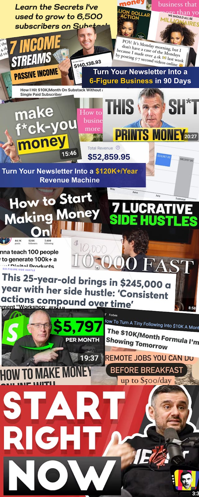 Your mindset is bad, you’re unmotivated, you make too many excuses, your discipline is weak. Do you even wake up at 5 a.m.? You’re not hungry enough. Be your own boss. Get out of the rat race. Hustle. Anyone can do it. You have a business inside of you. Grind. You have every tool available to make money while you sleep. Hustle-grind. Look, a homeless guy did it. Even that mommy blogger. You have no excuses. Hell, capybaras go viral every day. The only person holding you back is yourself. Sleep when you’re dead. Skills are cheap, passion is priceless.