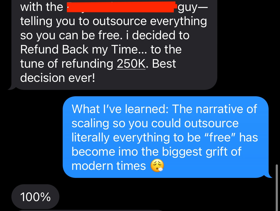 For years, I was its loyal disciple. It was liberating and seductive. I became proficient in selling, audience and pricing psychology, narrative control, product development — all the tools needed to help others build their 6-, 7-, and 8-figure empires. With them, I nurtured the machine — and in return, it gave me freedom: no commute since 2015, flexibility to do whatever I wanted, and money.