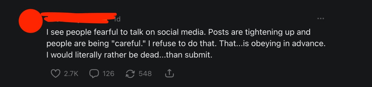 This one is particularly fascinating because it’s not clear how this person actually knows people are self-censoring. But it conjures up a familiar enemy — cowardice, conformity, and submission — and beats on a war drum for everyone to rise up.
